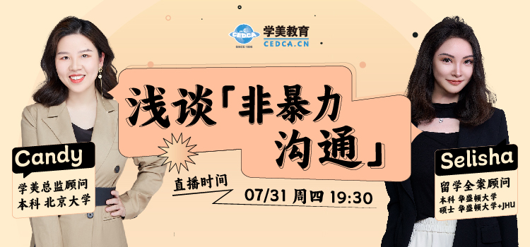 如何利用好Nonviolent Communication,而不伤害其他人?7月31日(周四)晚19:30,学美留学总监顾问Candy与留学全案顾问Selisha一起聊聊我们生活中解压的小妙招。