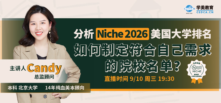 9月10日(周三)19:30,学美总监顾问 Candy 老师将在直播间为大家系统解析科学选校方法。从排名背后的逻辑,到个人需求与数据的结合,带你掌握数据 + 需求 + 实操三位一体的选校思路,帮助大家科学制定选校清单,为后续申请打下坚实基础!