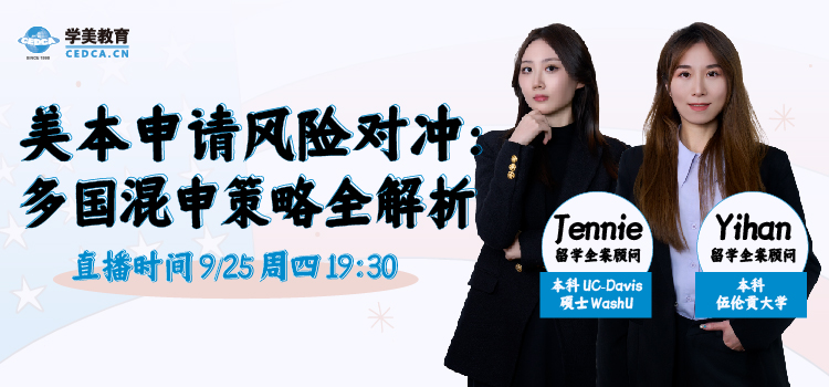 9月25日(周四)19:30,美本资深顾问 Jennie 和 Yihan 老师将带来主题分享——“美本申请风险对冲:多国混申策略全解析”。她们将系统解析多国申请的整体布局思路,深入剖析美、英、加、新等国家和地区的申请逻辑,帮助你掌握多国混申的平衡之道,在激烈竞争中最大化录取机会。
