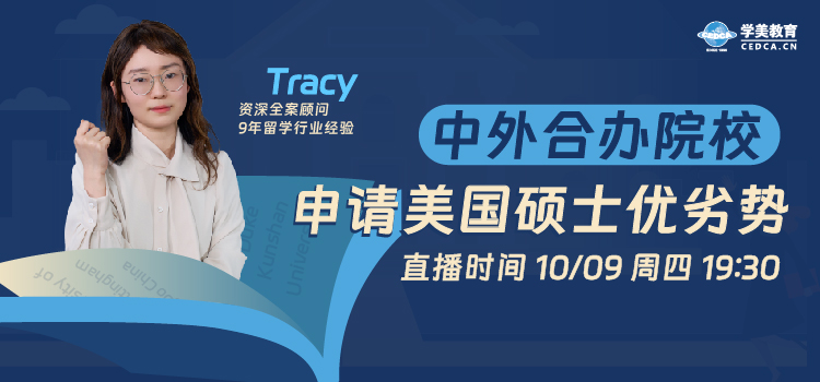 10月9日(周四)19:30,学美资深顾问Tracy老师将在直播间带来专题分享——“中外合办院校申请美国硕士的优劣势”解析,深入剖析中外合办背景在美研申请中的真实含金量,帮你明确定位、科学规划升学路径。