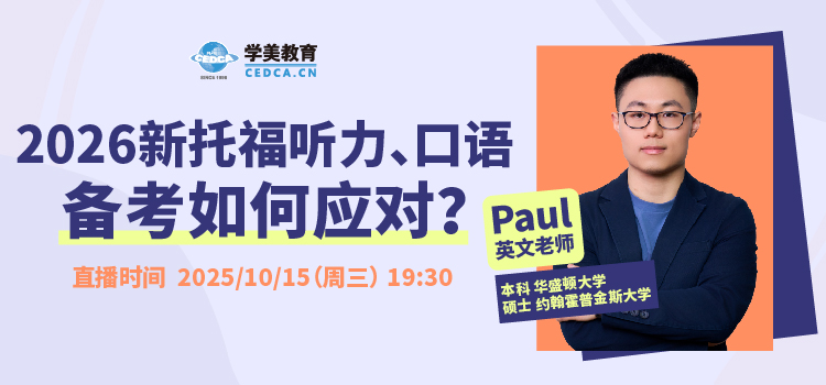 10月15日(周三)19:30,学美英文老师Paul将在直播间带来专题解析,2026新托福听力与口语改革方向,分享实用的核心应对策略,帮助大家快速适应新题型、高效备考,稳步提分!