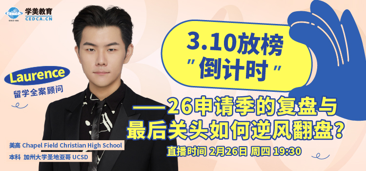 3.10放榜越来越近,很多家庭的情绪也开始被拉满。这一季发生了什么变化?竞争到底卷在哪?如果结果不如预期,最后关头还有没有逆风翻盘的空间? 2月26日(周四)19:30,Laurence老师将在学美直播间深度复盘26美高申请季,拆解关键趋势与逆风应对策略。在结果揭晓前,看清形势、提前布局。欢迎预约锁定。