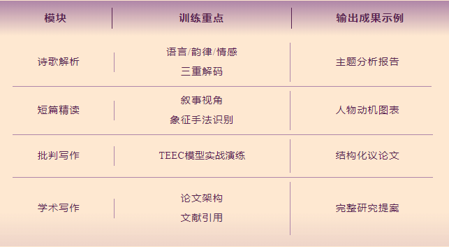 完整覆盖学术技能模块和训练重点,有效通过成果展现学习成效: