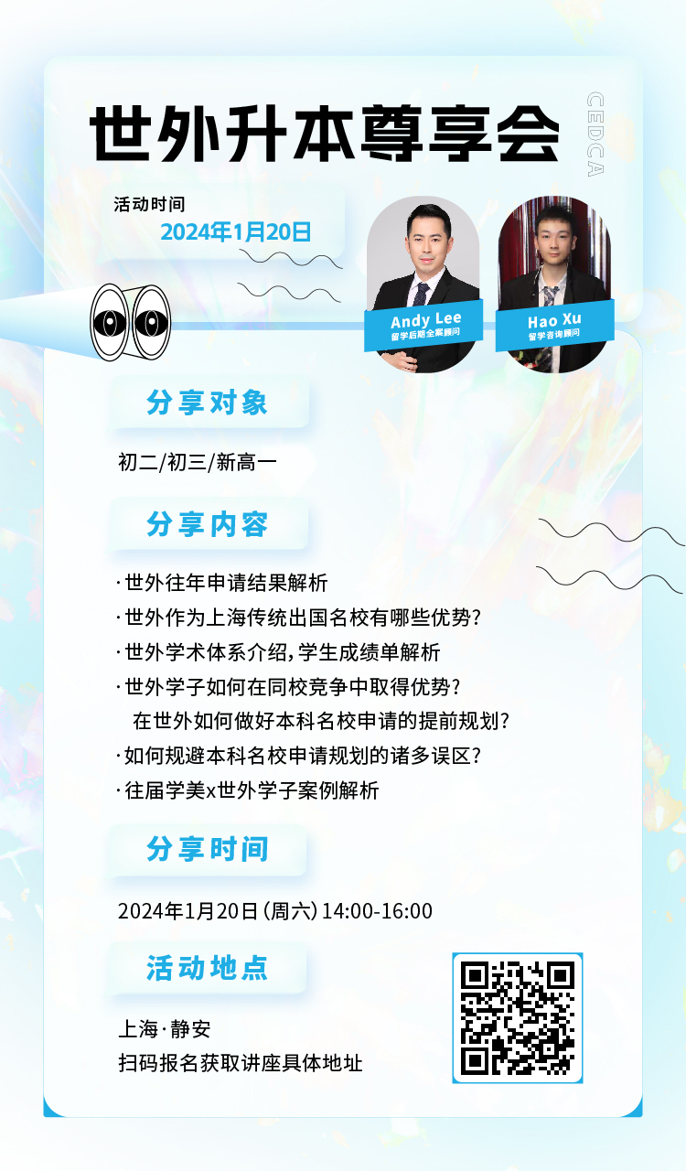 本周六(2024.1.20),上海世外升本尊享会专场,资深留学顾问将在现场为大家带来专业的解答,有兴趣的家长和学生可以扫描文中二维码提前报名~