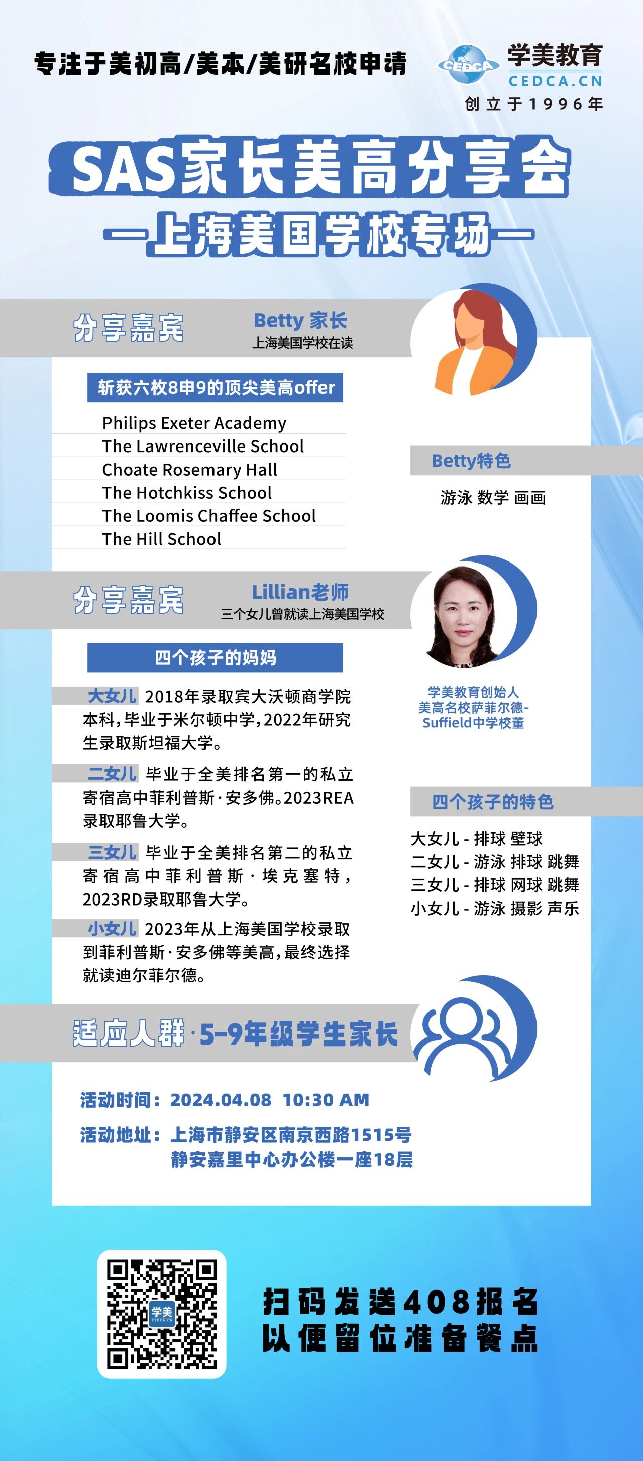 对于目前就读5-9年级的学生,应该如何选择合适的美国高中呢?已经有目标校的学生,家长又应该如何配合才能给到全方位的支持呢?4月8日上午10:30,学美教育将在上海举办一场SAS家长美高分享会——上海美国学校专场。Betty妈妈和Lillian老师将在现场与大家面对面分享珍贵的亲身经验,探讨她们与孩子们的成长故事。