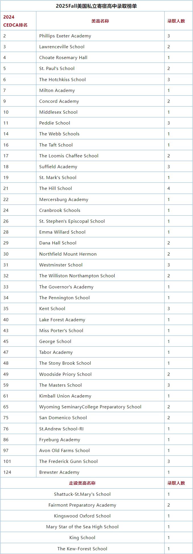 2025届美高学员补录佳绩频传,截止到今年四月,我们已经服务了47位美高学生,其中40名入读寄宿美高、7名入读走读美高。部分美高录取榜单如下: