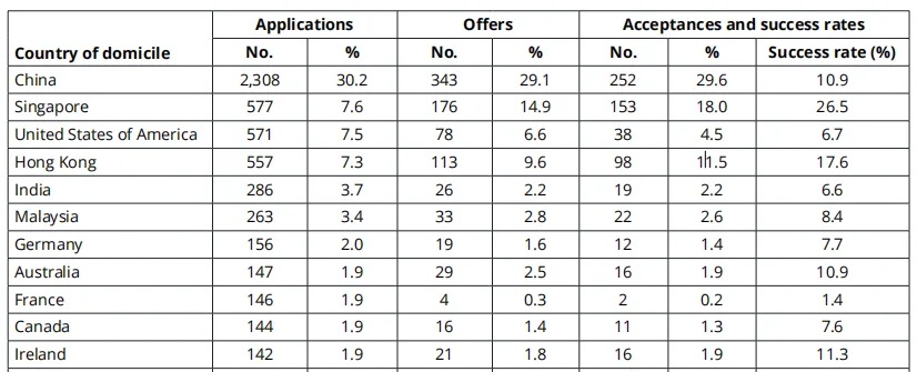• 香港 :中国香港的申请数为 557 人,录取 98 人,录取率上升至 17.6%,较上一年的 14.9% 提升明显 。
