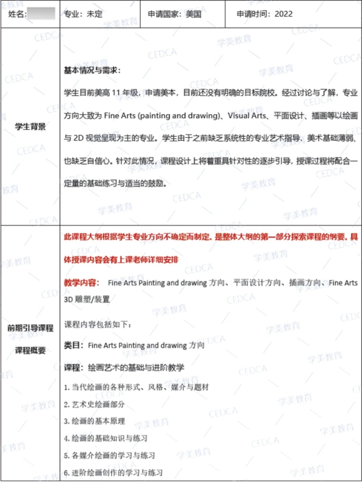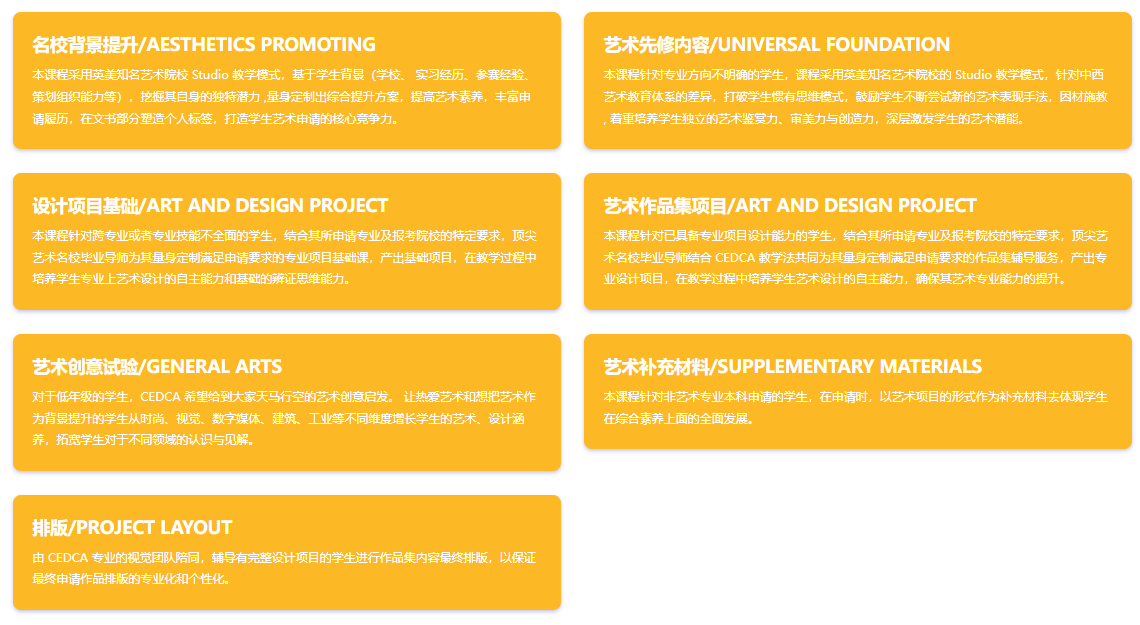 课程采用英美知名艺术院校 Studio 教学模式,基于学生背景(学校、 实习经历、参赛经验、策划组织能力等),挖掘其自身的独特潜力 ,量身定制出综合提升方案,提高艺术素养,丰富申请履历,在文书部分塑造个人标签,打造学生大学申请的核心竞争力。