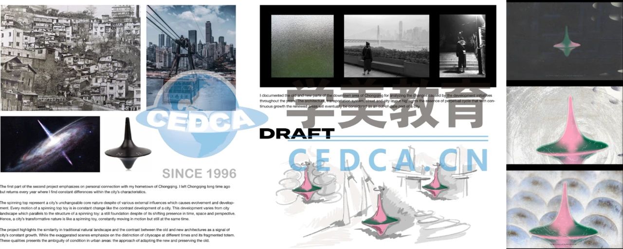 例如,C同学在自己的项目中,将来源于每次回到家乡重庆城市新旧建筑的变化的感触作为灵感,用儿时玩的一个陀螺为表达形式,来探索发展城市建筑如何与旧建筑融合的方法。