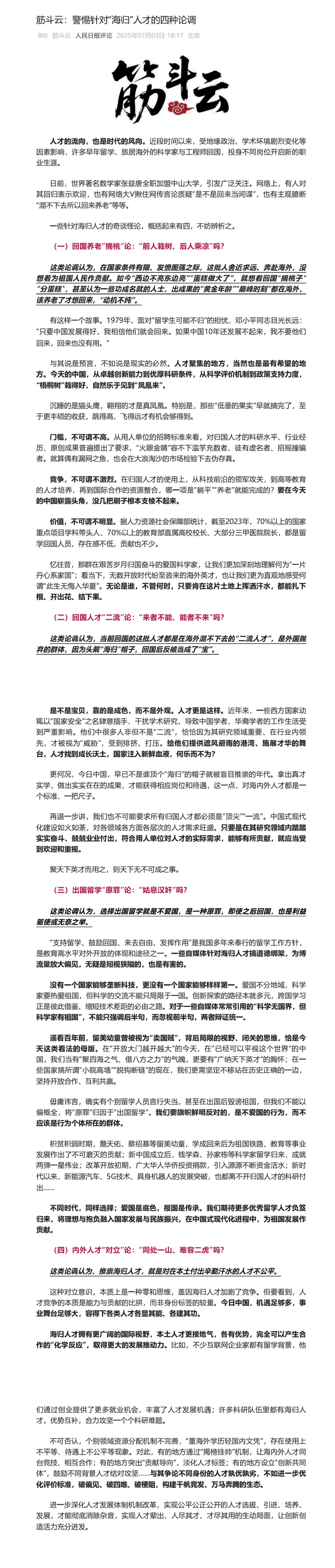 7月初,《人民日报评论》发表文章,系统驳斥了围绕海归群体的四种错误论调,为“留学归国”正名。