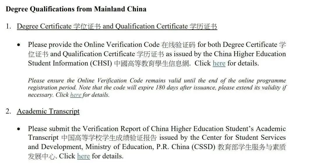 – 内地生:学位证/成绩单须由 CHSI 直接发电子验证报告;