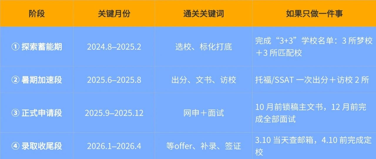 8月做托福首考摸底 → 12 月前托福 ≥90;次年 1 月首考 SSAT。