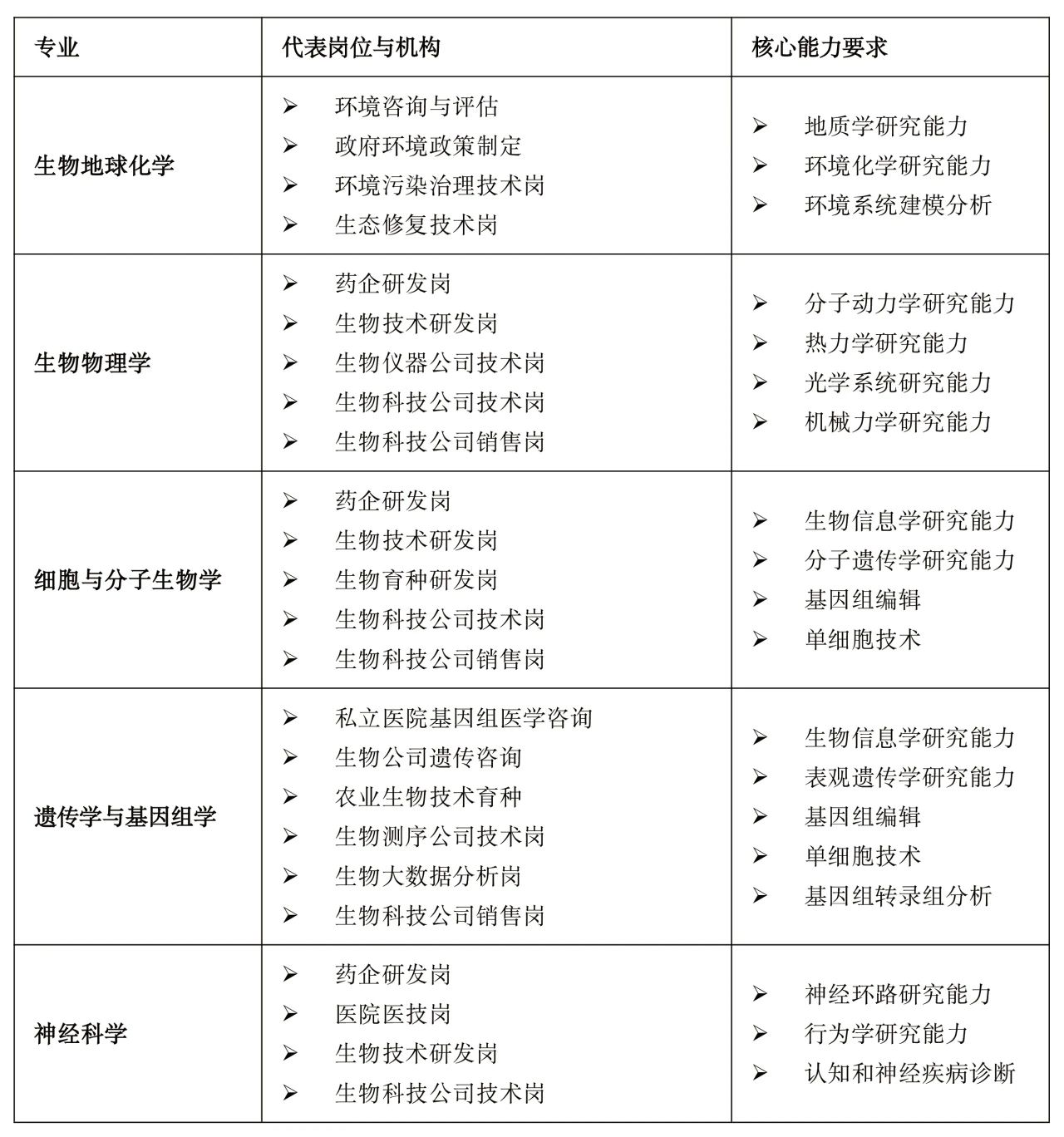 除生物化学、细胞与分子生物学、遗传学与进化等核心课程外,还支持将生物地球化学、生物物理学、功能基因组学、神经生物学、生物统计学、计算生物学与生物信息学等领域结合,满足学生多元化发展;