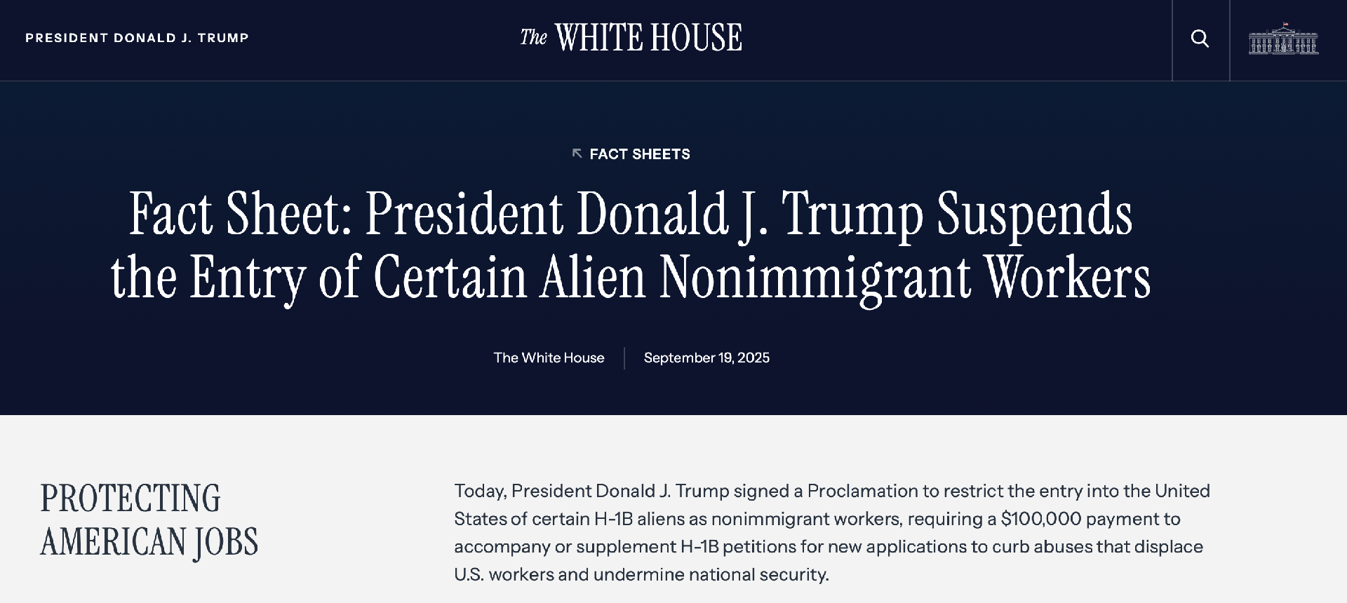 当地时间9月19日,美国总统正式发布了公告(Presidential Proclamation),宣布对 H-1B 签证实施新的限制和收费要求:每份H-1B签证申请费用飙升至10万美金 !