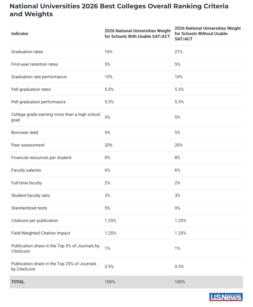 其二,在排名类别上,今年没有学校发生变动,最终公布的榜单与此前传达给各校的版本保持一致。回顾去年的评估体系,U.S. News 的关键指标包括学生保留率、毕业生负债与收入、佩尔助学金学生的毕业率、教师资源以及专家意见等多项维度。