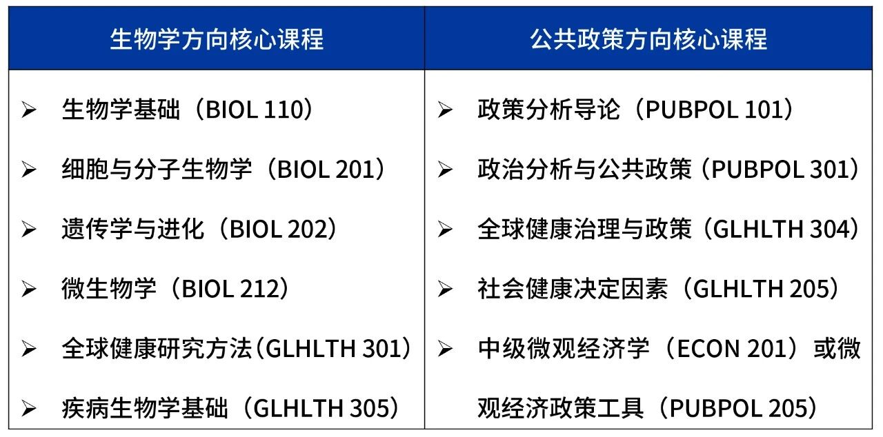 昆山杜克的全球健康学专业分为生物学和公共政策方向两大课程分支,分别的主修课程设置如下: