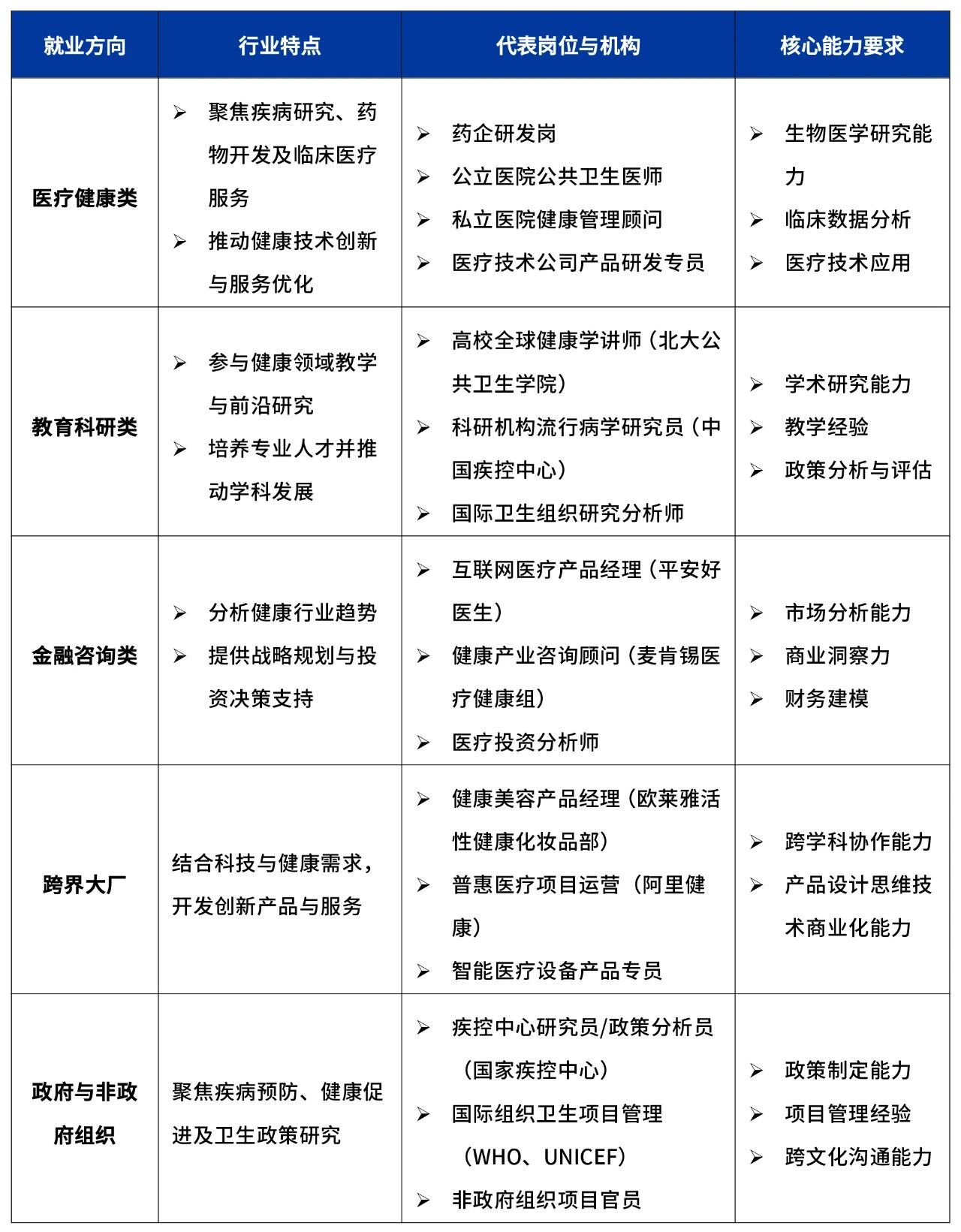 全球健康专业的跨学科特性使毕业生在多个领域具备竞争力,后疫情时代复合型人才需求显著增加,前景较好,建议学生在校期间积累实习经验(如疾控中心、国际组织) 参与科研项目(如传染病建模、卫生政策分析),医学背景与政策分析能力、数据分析工具(R/Python)及多语言沟通能力的兼备可以大幅度提高就业的竞争力哟!