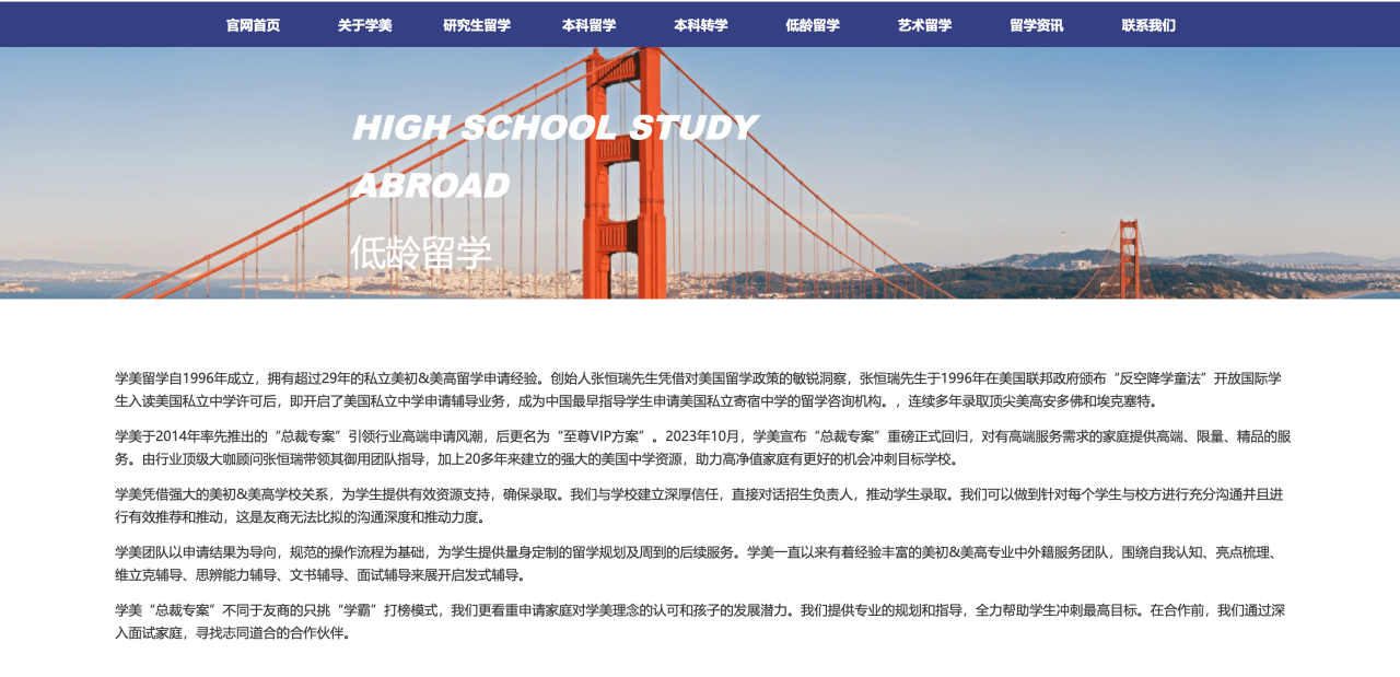 学美教育于1996年在美国联邦政府颁布“反空降学童法”开放国际学生入读美国私立中学许可后,即开启了美国私立中学申请辅导业务,是中国最早指导学生申请美国私立寄宿中学的留学咨询机构。学美教育迄今已连续 29 年为中国家庭提供专业的私立美初、美高、美本、美本转学和研究生的留学申请指导服务。