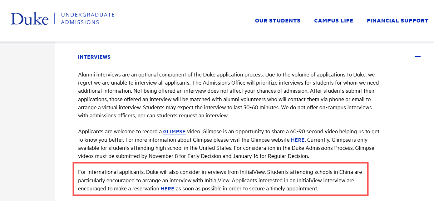 以杜克大学为例:对于国际申请者,杜克大学会考虑 InitialView 的面试,但是特别鼓励中国学生安排 InitialView 的面试 。