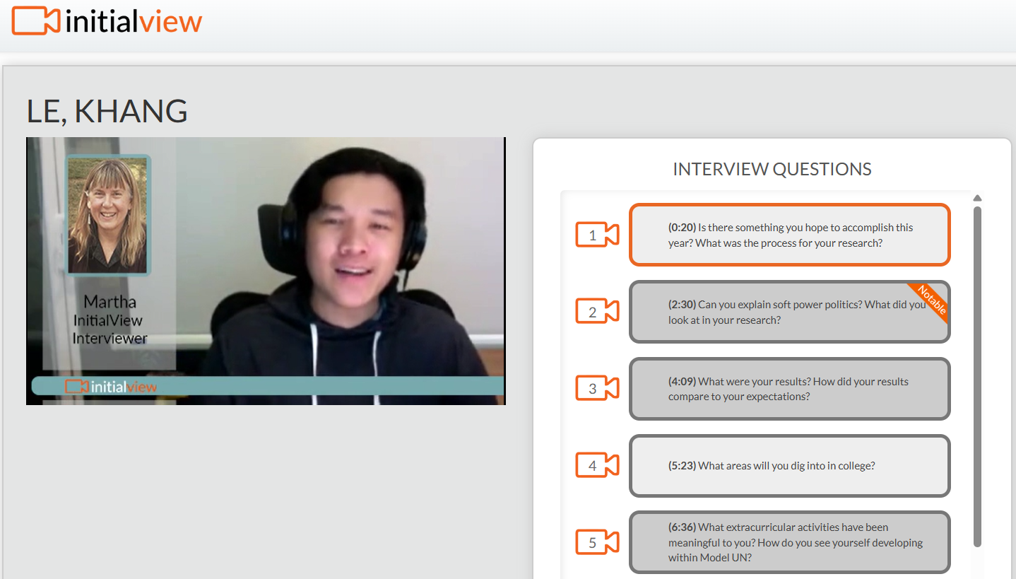 发送面试给大学时,可以选择其中某一个自己表现得比较好的段落设为“Notable Question”,提醒招生官可优先注意这个部分。在选择Notable Question时,建议挑选自己回答中最能体现个人逻辑清晰、独特经历或与目标学校契合度高的部分,例如关于领导力、学术兴趣和个人经历亮点的回答。