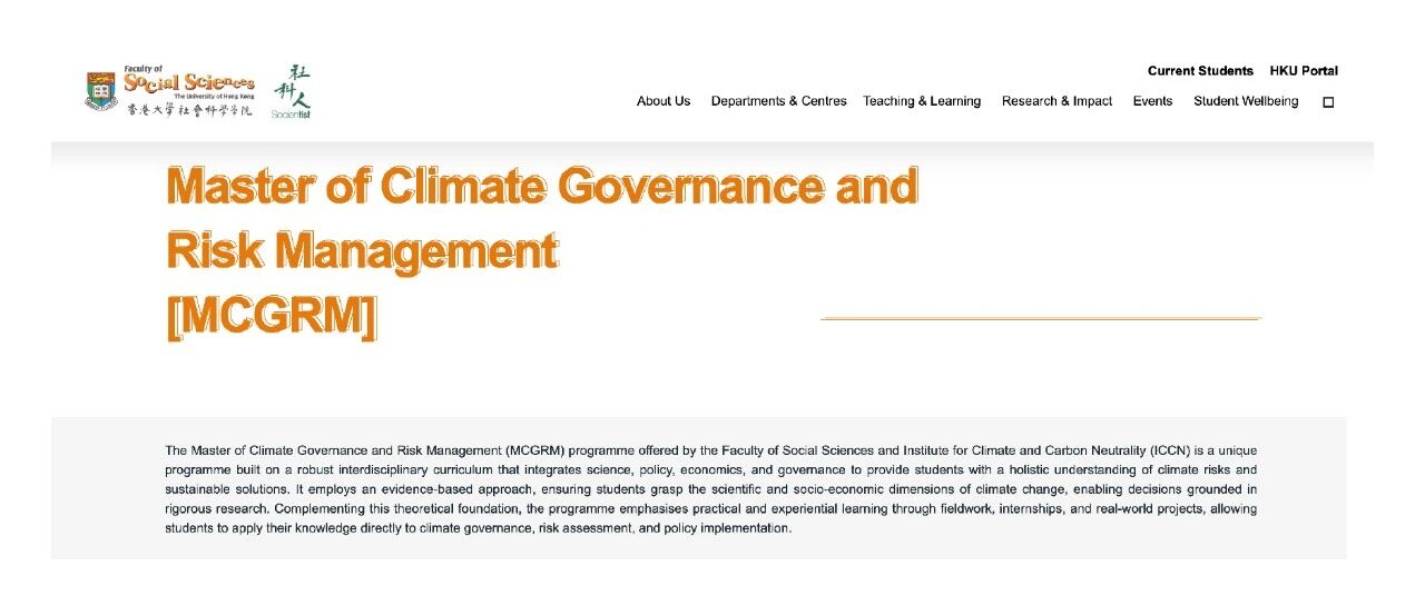 亮点:今年才从商学院独立出来,依托港大新设立的"气候与碳中和学院",是学院目前唯一的硕士项目。又是一商科和气候环境相交叉的项目,聚焦ESG投资、碳中和政策与气候风险管理,为投身绿色金融、政府智库及咨询领域提供精准准备。