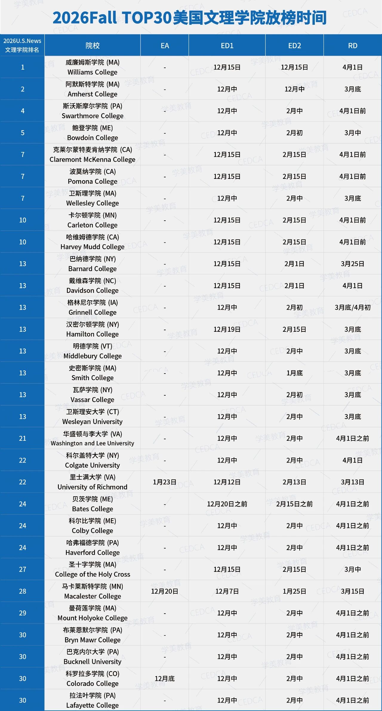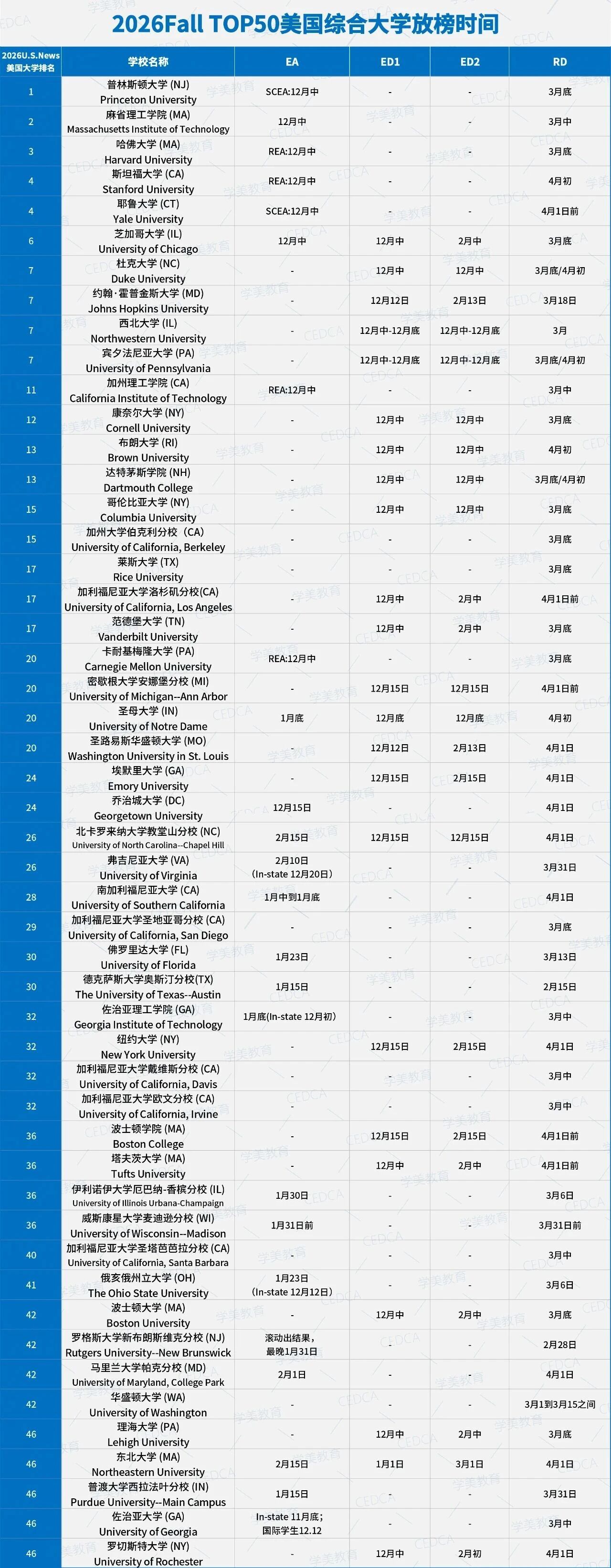 美本申请的年度“揭榜季”即将到来!随着早申材料陆续提交,各大高校的放榜时间也陆续公布。学美已为大家整理好 2026 Fall 美国综合大学 Top50 及文理学院 Top30 各轮次的放榜时间表——部分采用学校官方发布日期,部分基于往年节奏进行预测。希望这份时间表能帮助大家更清晰地把握放榜节奏,及时规划补申策略与后续材料准备,更从容地迎接即将到来的录取季。