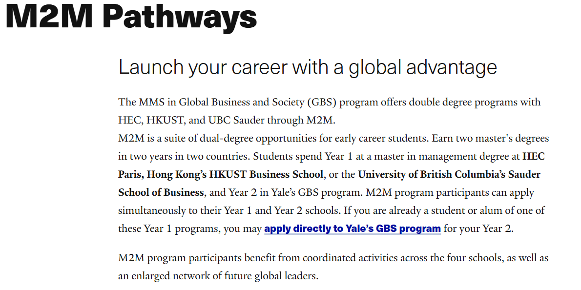 耶鲁大学管理学院(SOM)与全球顶尖商学院(如巴黎HEC、香港科大、UBC等)联合开设的双学位项目。课程体系面向职业生涯初期的学生,深度融合全球化商业战略、可持续发展领导力与跨文化管理实践,致力于培养具备国际视野与社会责任感的未来商业领袖。