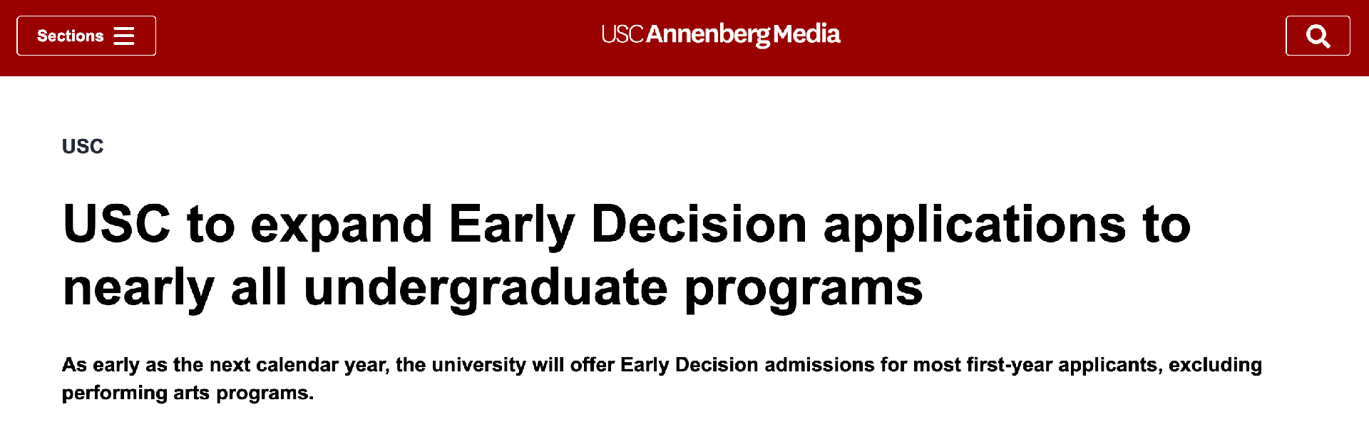 4月1日,USC刚发完这一轮常规申请结果。但对于下一届申请的学生来说,更值得关注的,其实不是今年的放榜,而是一个更早释放的变化——从2027 Fall申请开始,USC将把Early Decision(ED)扩展到几乎所有本科项目。申请截止时间为2026年11月1日,结果将在12月中旬公布(舞蹈、音乐和戏剧类项目暂不包含在内)。