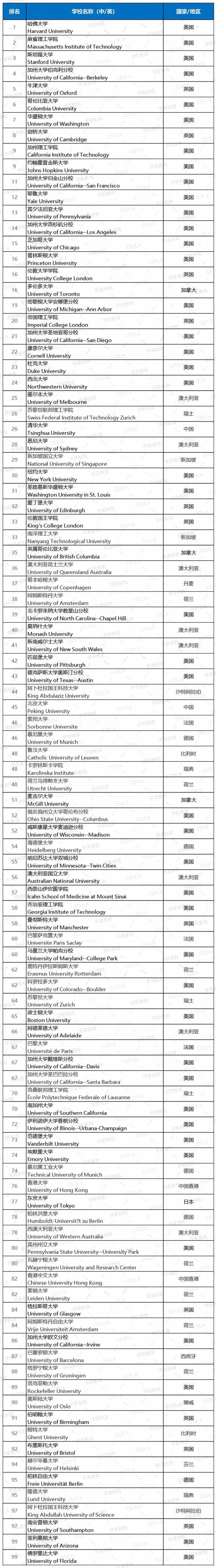 其他的老牌欧美名校也均在前20的位置上展露头脚。此外值得关注的是,中国清华大学位列第26名,比去年的28名上升了2名,再次进入TOP 30榜,北京大学排45名,上升了6名。清华北大的世界排名已经连续四年上升,这两所中国历史名校依然在全球学术领域中引领着中国地位。